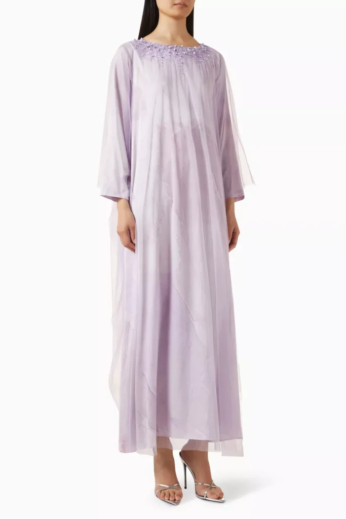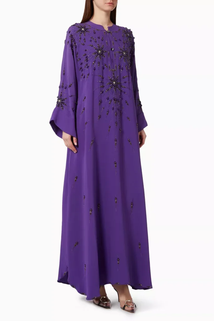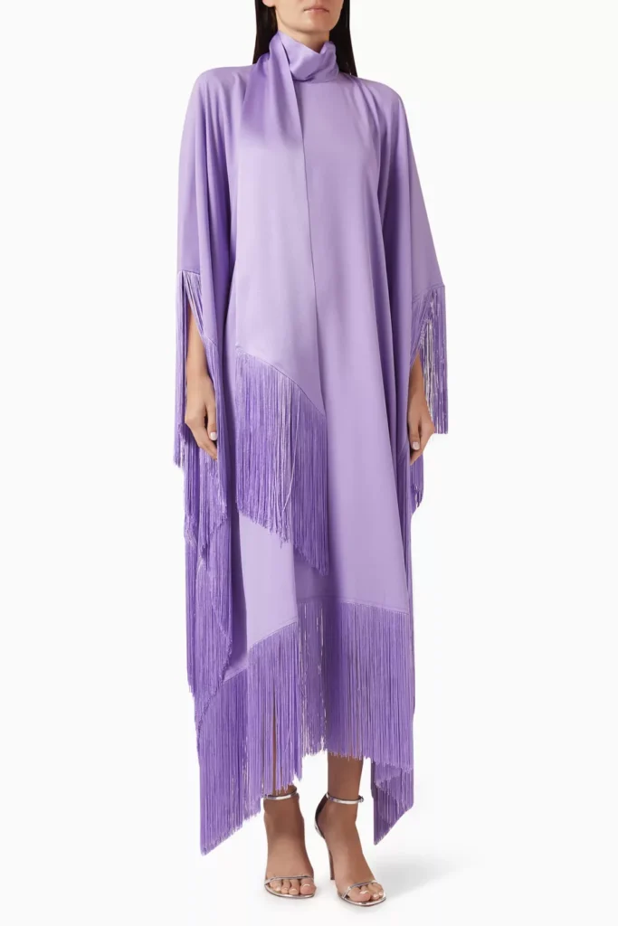 Really, the colour is everywhere! And while it can be a polarising one, it is fairly simple to style. You can go the regal route with jewel-toned abayas and kaftans, or keep things soft and demure with lilac and lavender tops and dresses. When it comes to colour combos, purple sits flush against white, feels creative with mustard yellow, and looks cosy and rich with browns and reds. For a pop, a bag or sneaker will do. For an accent, accessories like belts and sunglasses will do the job. And if you’re looking for the skin to match the clothes, then a bit of purple blush wouldn’t hurt!