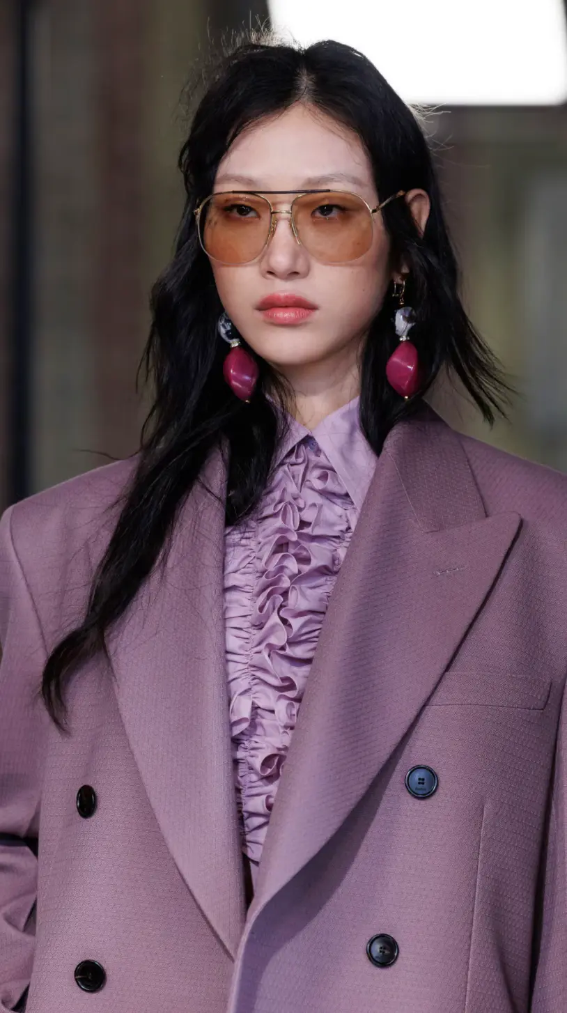 In the Resort 26 collection, Chanel introduced a soft lilac tweed suit. Whereas Gucci went the opulent route with their Cruise 26 collection, showcasing an outfit ripe with purple florals and fur, a true-toned purple Horsebit Clutch trailing behind. The shade was even stronger this Autumn-Winter season, with +45% of looks entering the runway. We saw draped dresses at Balenciaga, trenches at Celine, and head-to-toe looks at Mugler, Giorgio Armani, Jil Sander, and more.