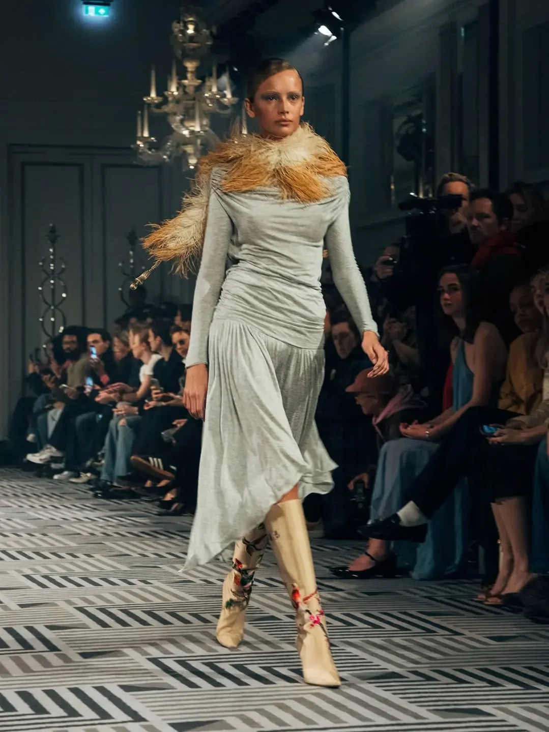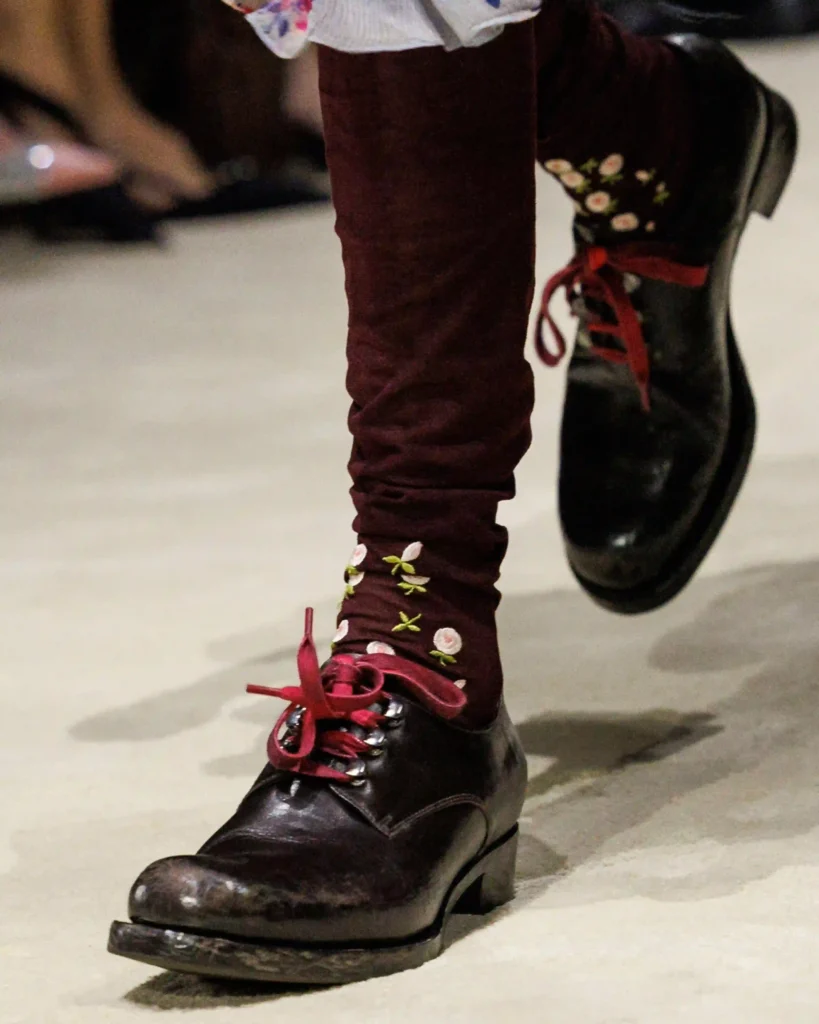 Autumn-Winter means the rise of boots, and this season gave us a lot to work with. One of our favourites was a floral embroidered piece in silk dupion, seen at Connor Ives AW26 runway. Partnering with Jimmy Choo, the footwear for the show was dressed in demi-couture flair. With the design, the boots were obviously made for showing off, and if we had a pair, they would be styled over a midi skirt, where movement allowed details to peek through.