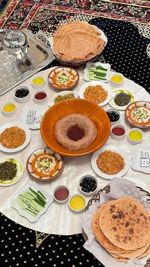 Levantine communities in Jordan, Palestine, and Lebanon all have similar breakfast tables. Fresh breads, fatayer, and dishes drizzled with olive oil are placed on the table. Ma’amoul cookies are the staple, even after breakfast, while in Palestine and Jordan, a simple meat dish called Sajiyeh is a must-have, almost becoming synonymous with Eid. Made in a saj pan, this dish is primarily bite-sized pieces of stir-fried beef and vegetables served with saj bread. It’s smoky and flavourful and might not be a typical breakfast dish, but those living in the Levant would heavily disagree.