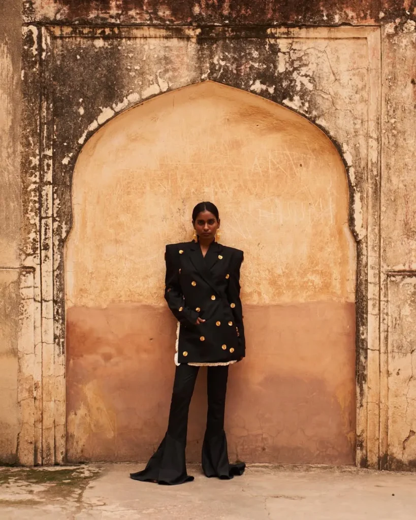 Traditional silhouettes can be hard to replicate in a cross-cultural fashion, but once again, independent designers are taking on the challenge. For SZABO SIHAG, a brand between London and India, fusion wear is at the core of the brand’s identity. Fabrics such as khadi, cultural symbols such as the lotus, and traditional silhouettes such as the drape of a dupatta are all reimagined in a contemporary lens, made to work with denim, asymmetry, and cheeky cutouts.
