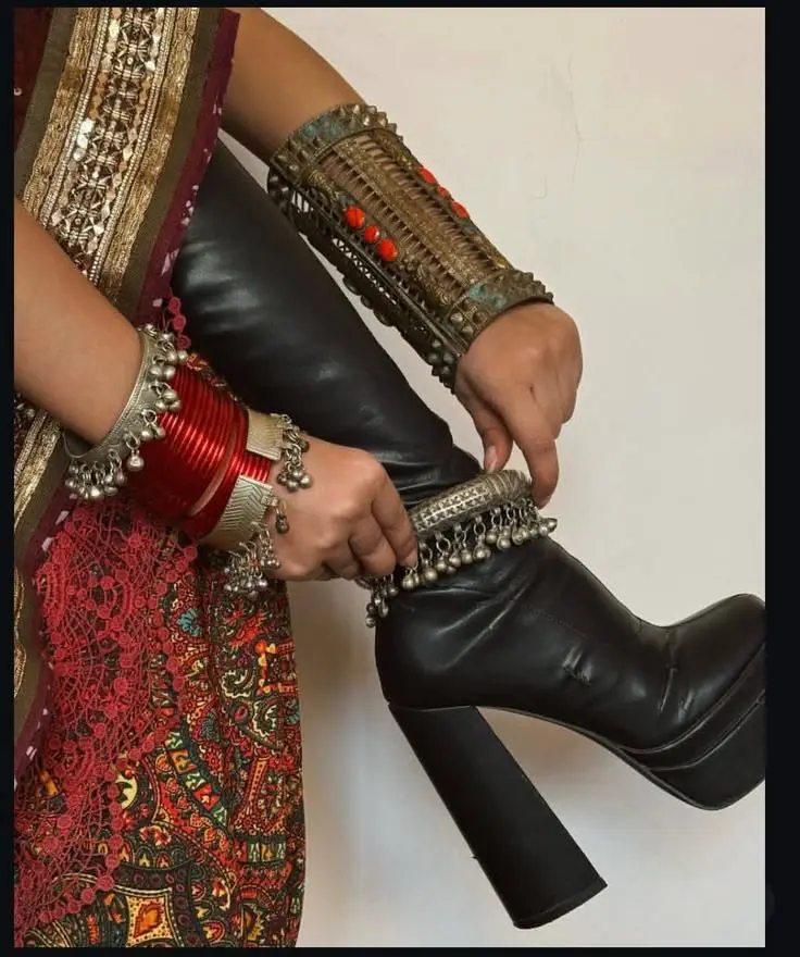 A combination mainly seen on South Asian fashion, part of Indo-Western wear, is rocking cultural jewellery such as jhumkas (earrings), choodiyaan (bangles), and payal (anklets) alongside standard Western clothing. A simple T-shirt and jeans can radically change with this jewellery lift.