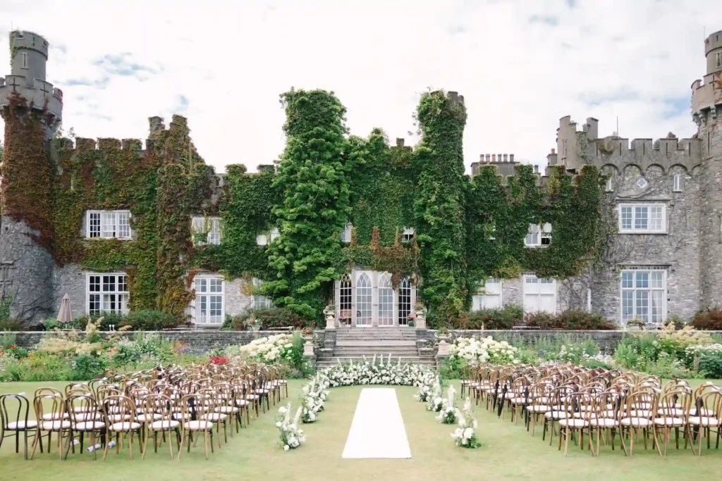 While some might think that the rainy weather makes Ireland a risky destination, the summertime negates all that. David and Victoria Beckham thought the same when they tied the knot in July 1999 at Luttrellstown Castle Resort in Dublin, Ireland. With ivy-covered walls and leafy trees, the pair exchanged vows at a stone cave in the castle grounds, followed by a lavish reception complete with oversized thrones and matching purple outfits.