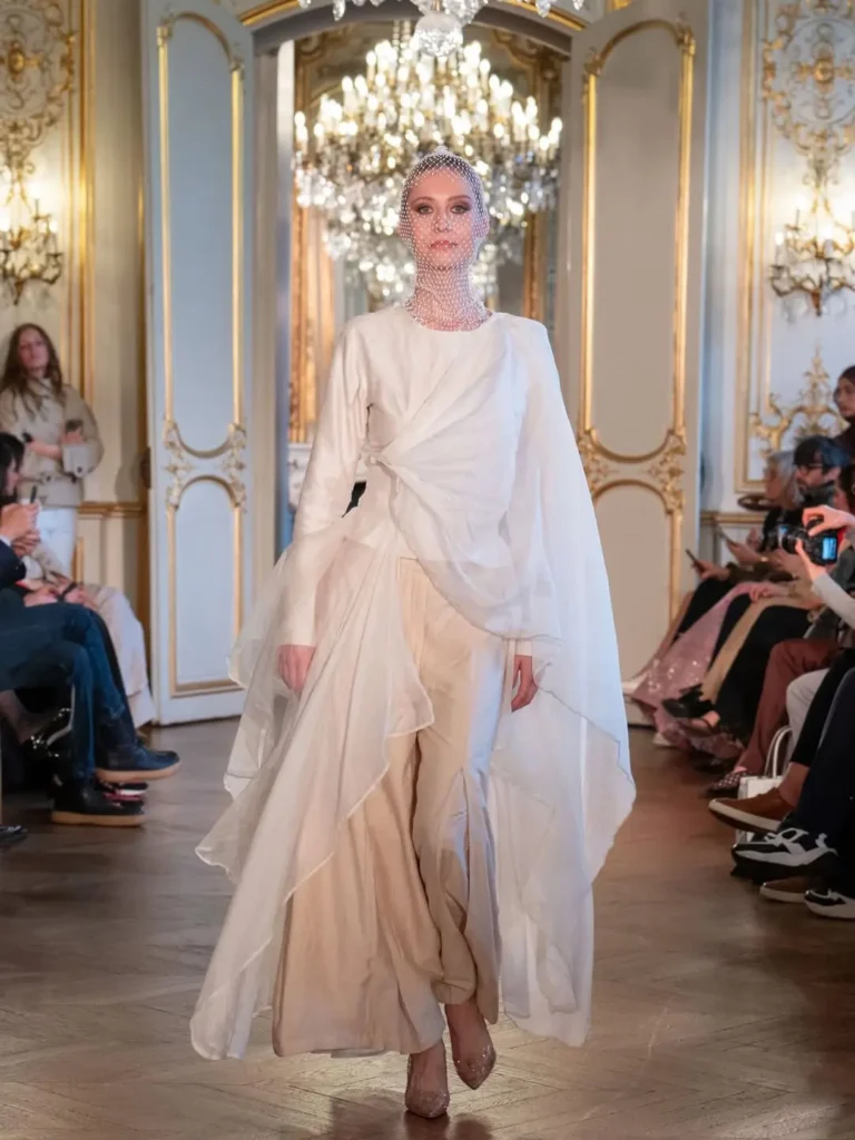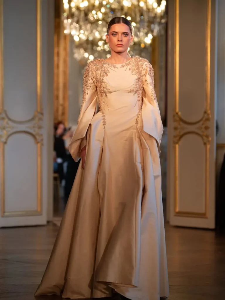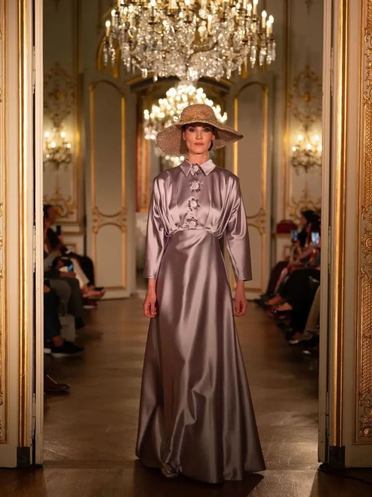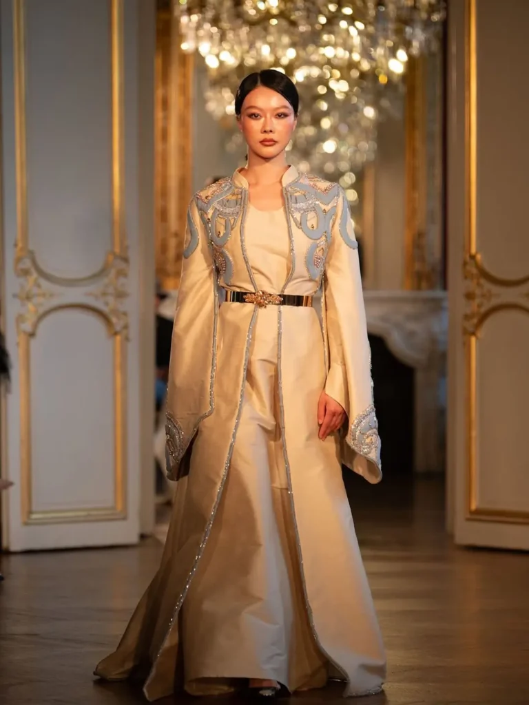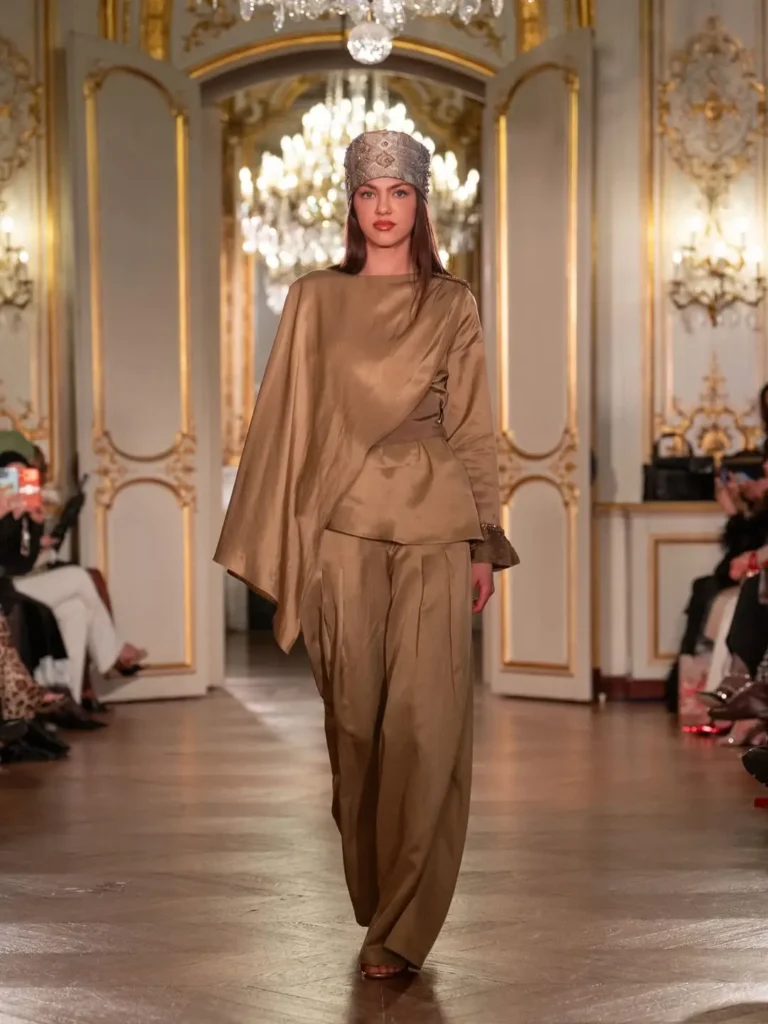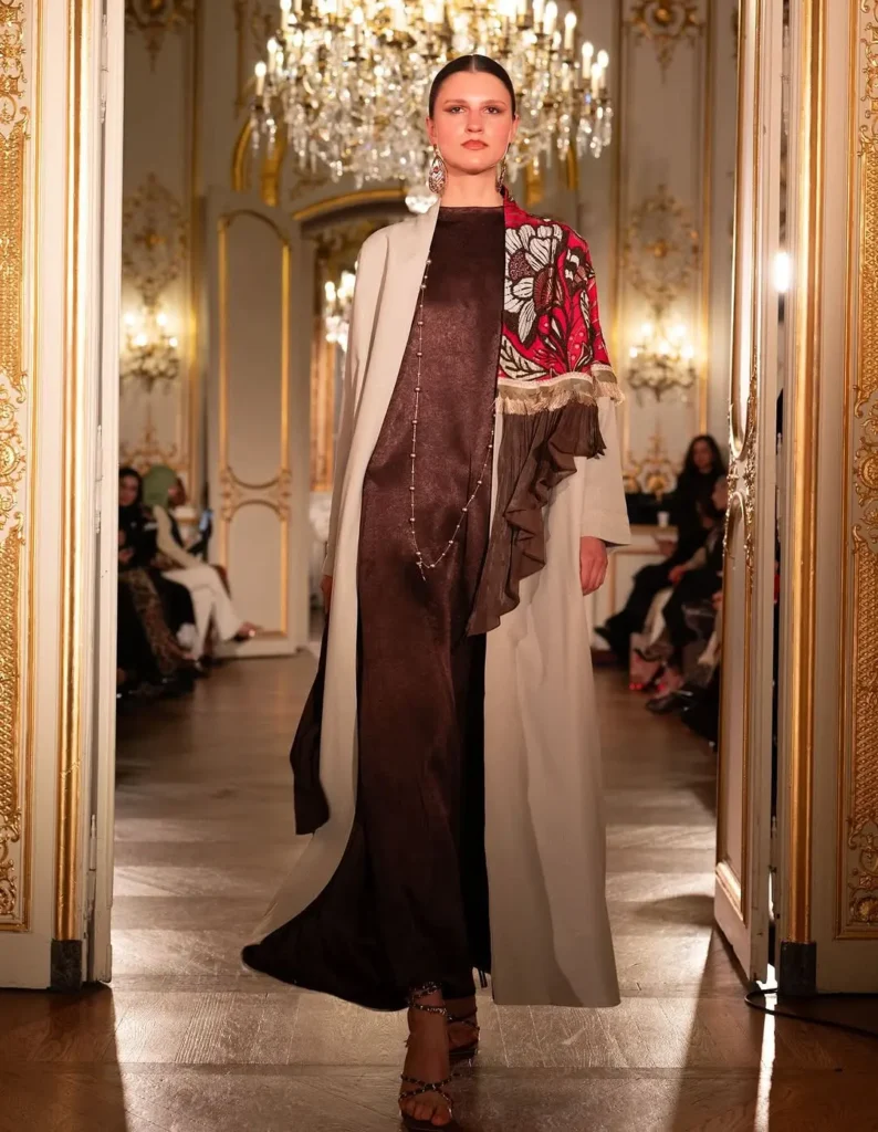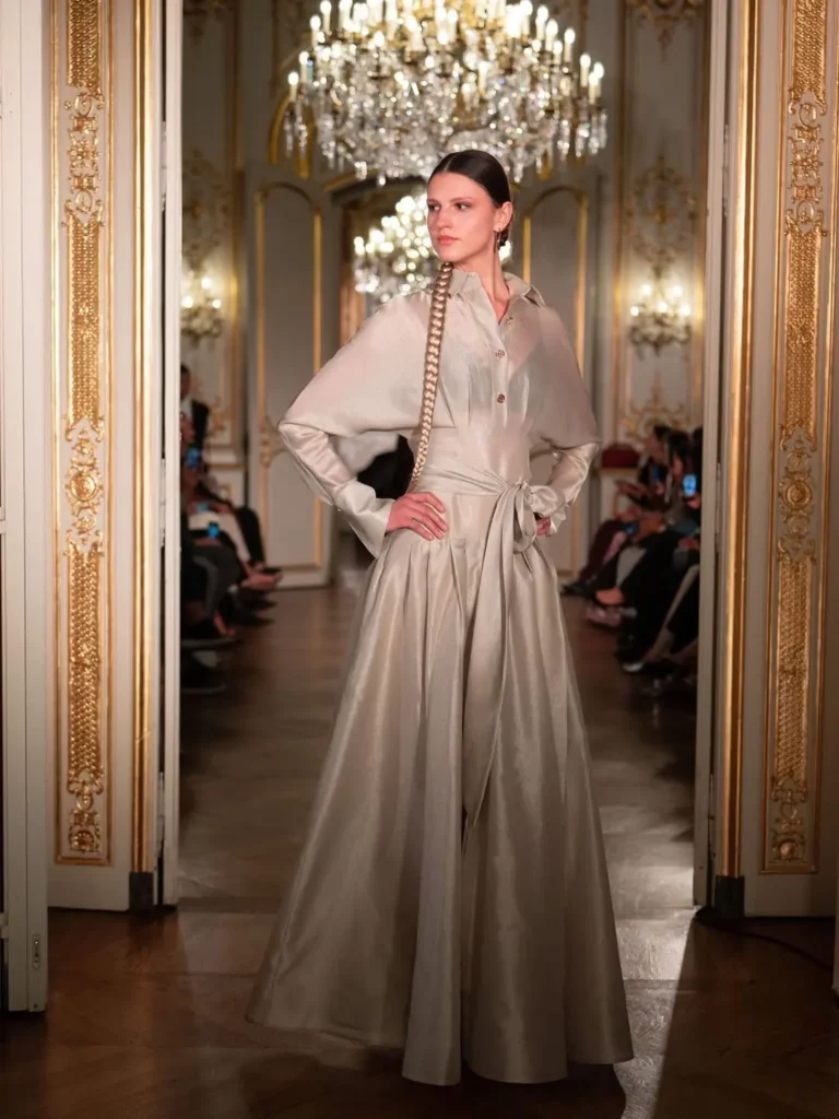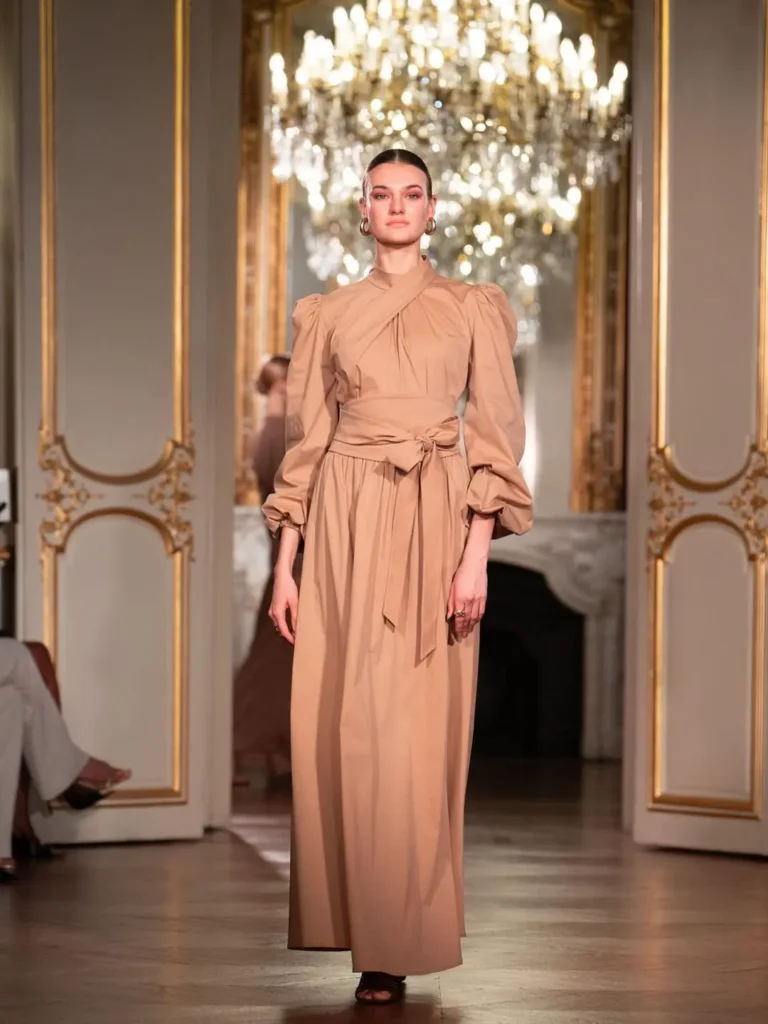 The Serbian-based house is known for its incorporation of Balkan tradition, be it through designs or past techniques. So opening Modest Fashion Week, the house stuck to its codes, presenting a palette of rich golds, browns, and light shades of cream into drop waist gowns and delicately embroidered kaftans that referenced architecture. Titled “The Unseen Crown”, designer Sedžda Zukorlić explained how the collection came to be by reflecting on her inner world. How feminine strength and struggle are rarely seen. Through the designer’s reflections, the collection continues to observe female identity where form and details balance one another. It is regal, refined, and opulent in a traditional sense that complements the gilded room at the Hôtel Le Marois.