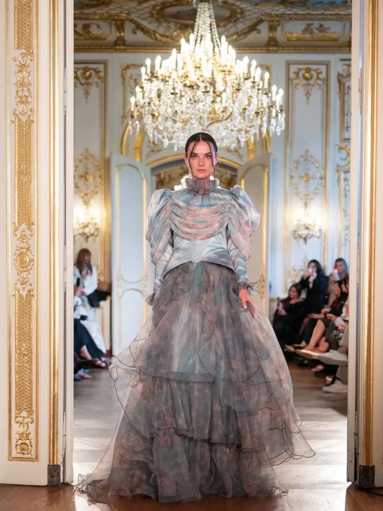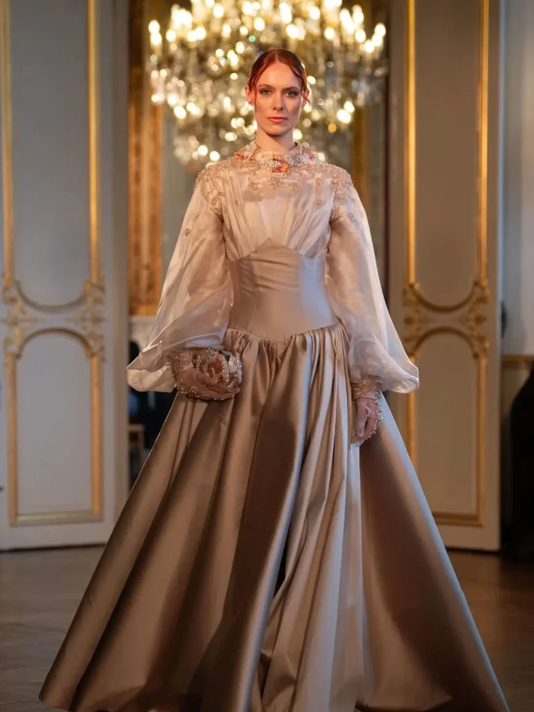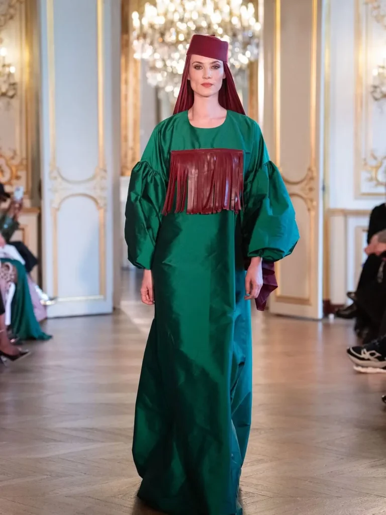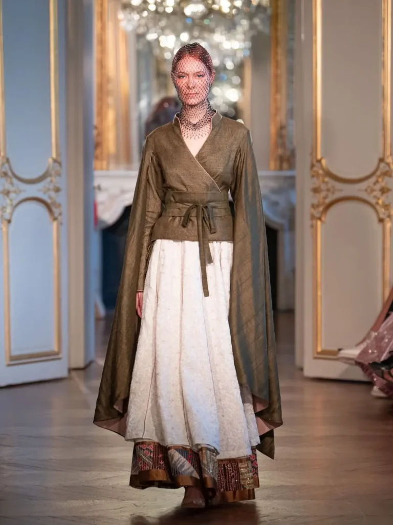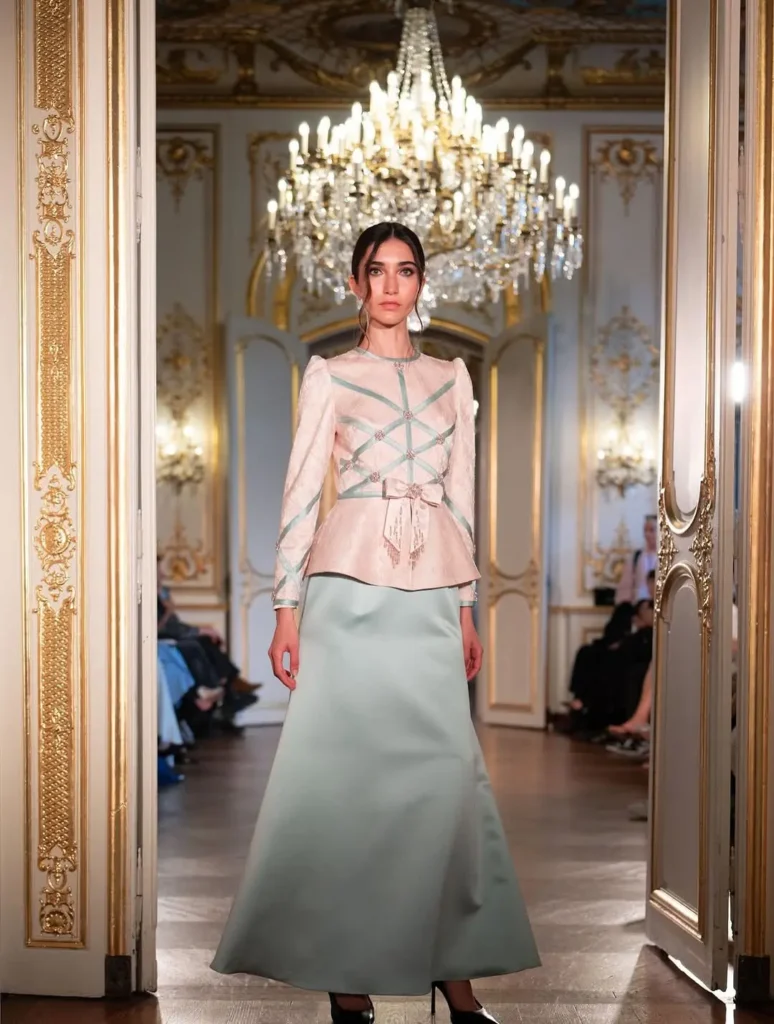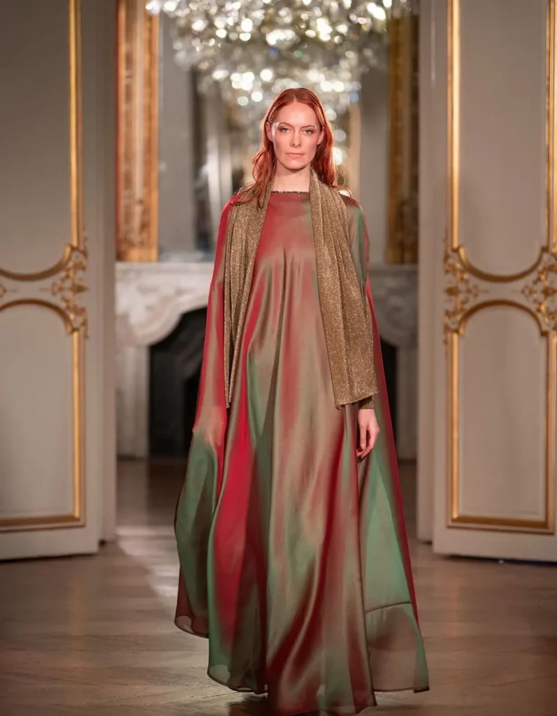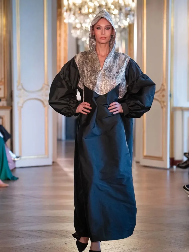 The Serbian-based house is known for its incorporation of Balkan tradition, be it through designs or past techniques. So opening Modest Fashion Week, the house stuck to its codes, presenting a palette of rich golds, browns, and light shades of cream into drop waist gowns and delicately embroidered kaftans that referenced architecture. Titled “The Unseen Crown”, designer Sedžda Zukorlić explained how the collection came to be by reflecting on her inner world. How feminine strength and struggle are rarely seen. Through the designer’s reflections, the collection continues to observe female identity where form and details balance one another. It is regal, refined, and opulent in a traditional sense that complements the gilded room at the Hôtel Le Marois.