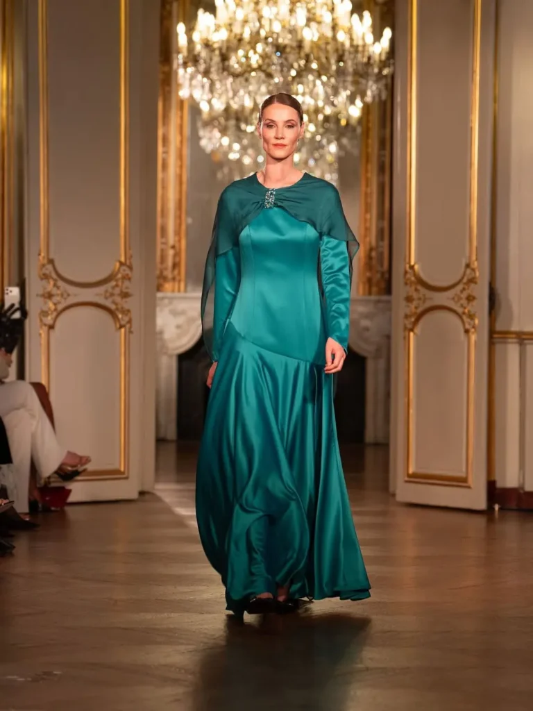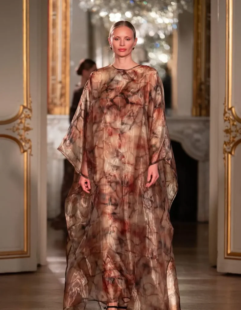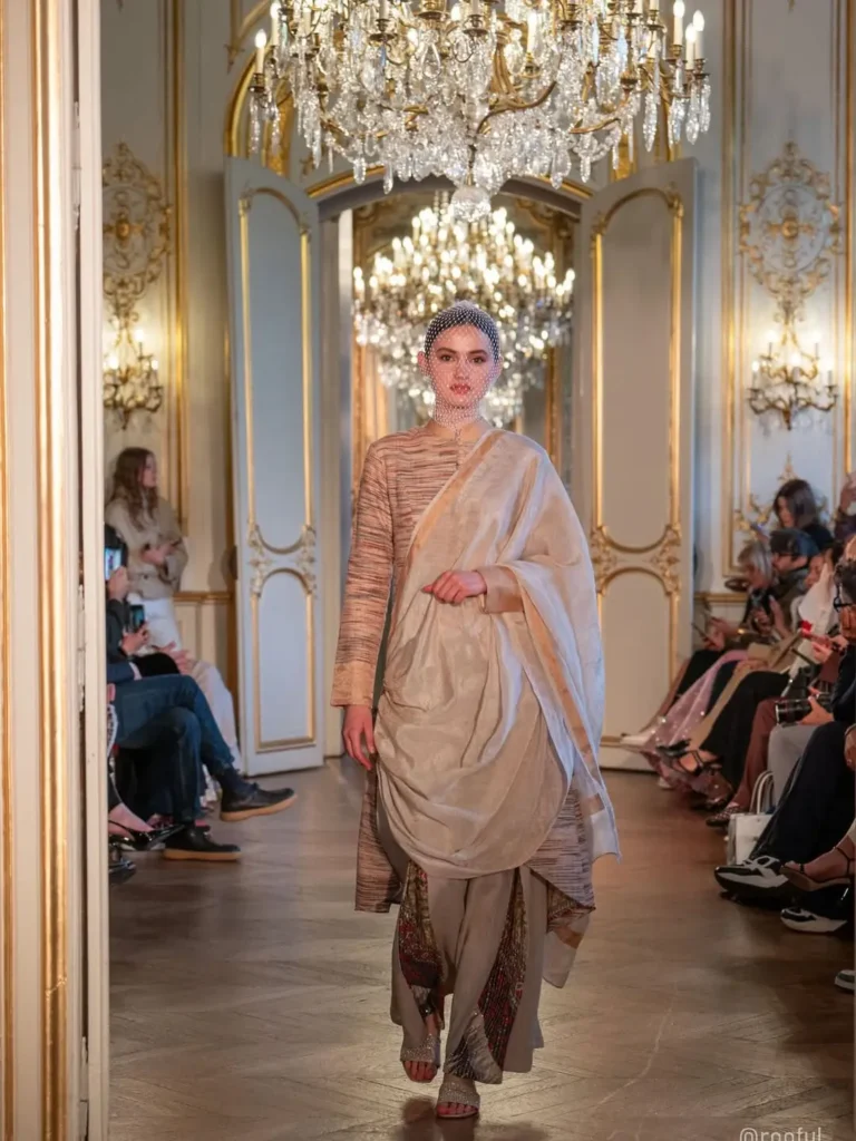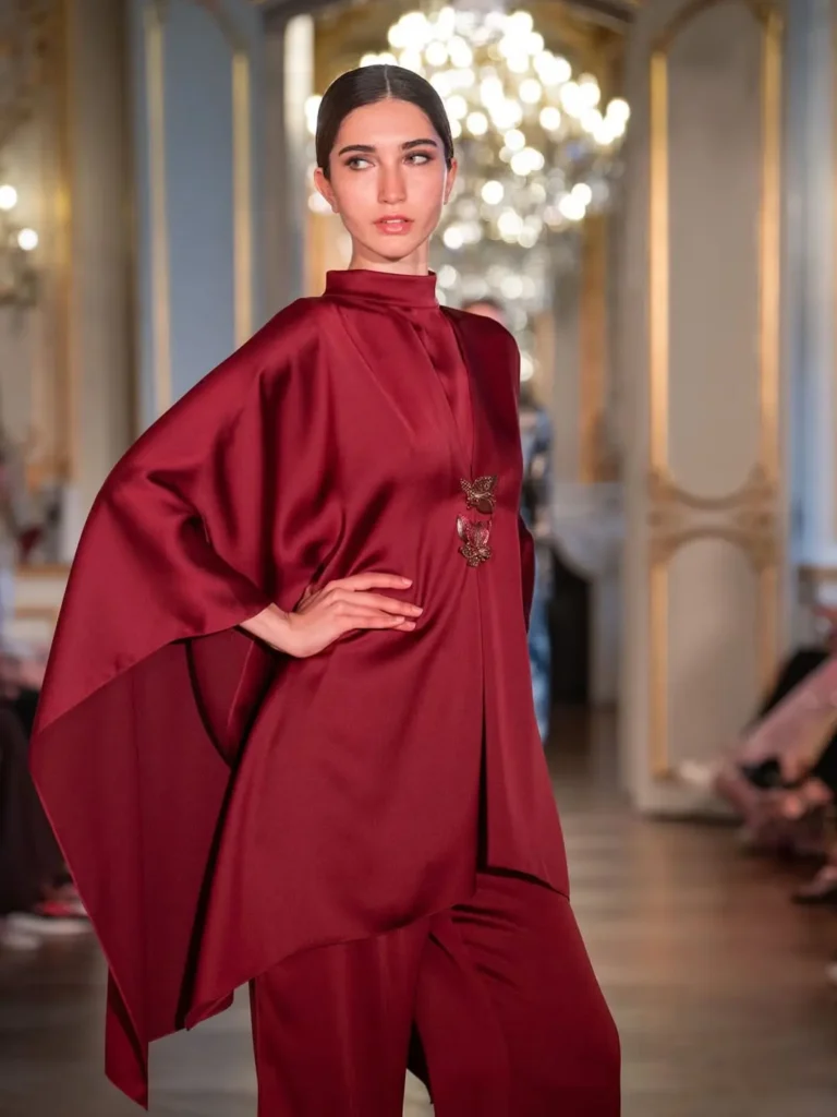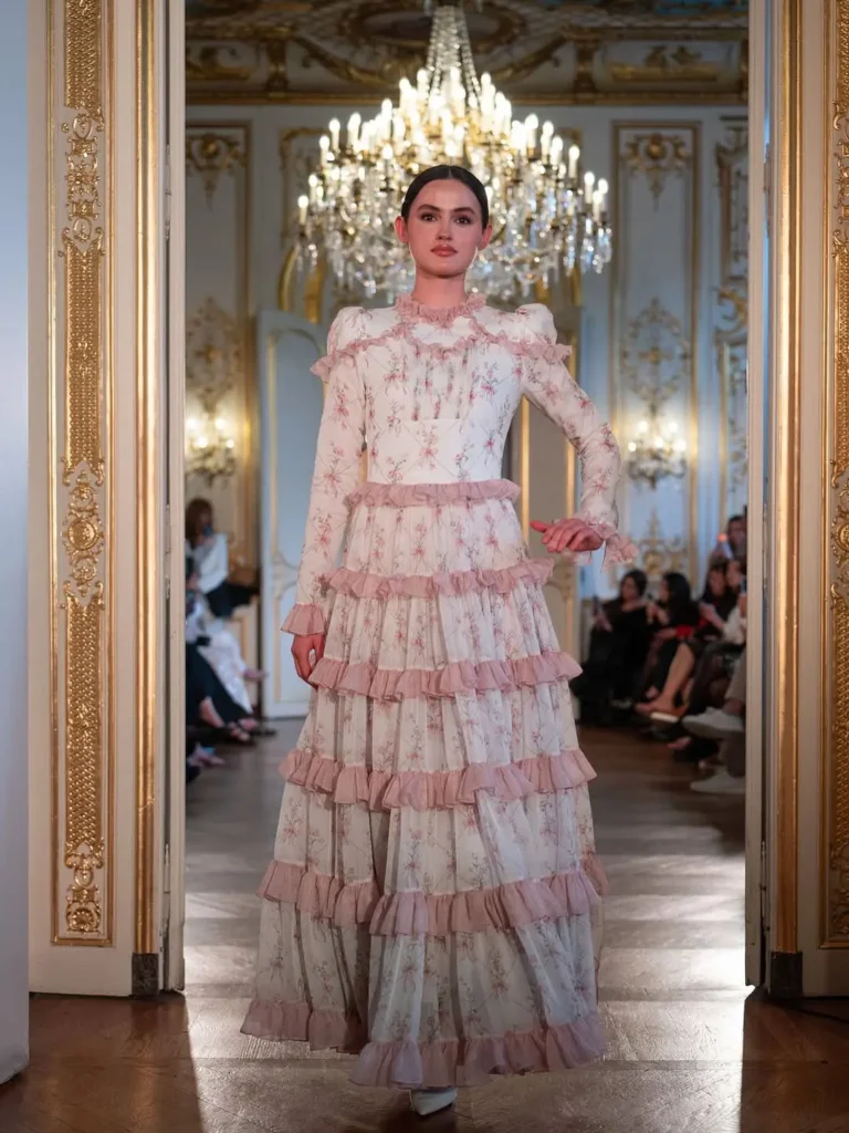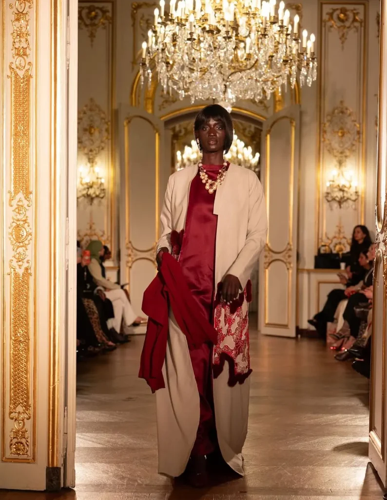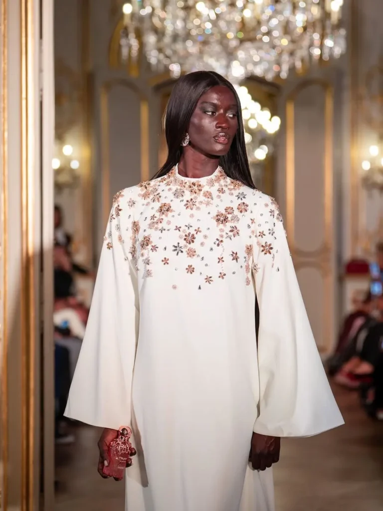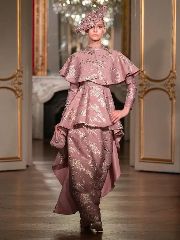 The Serbian-based house is known for its incorporation of Balkan tradition, be it through designs or past techniques. So opening Modest Fashion Week, the house stuck to its codes, presenting a palette of rich golds, browns, and light shades of cream into drop waist gowns and delicately embroidered kaftans that referenced architecture. Titled “The Unseen Crown”, designer Sedžda Zukorlić explained how the collection came to be by reflecting on her inner world. How feminine strength and struggle are rarely seen. Through the designer’s reflections, the collection continues to observe female identity where form and details balance one another. It is regal, refined, and opulent in a traditional sense that complements the gilded room at the Hôtel Le Marois.