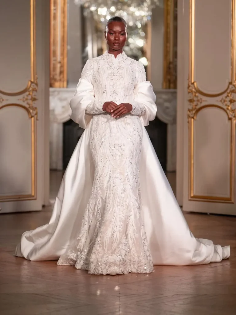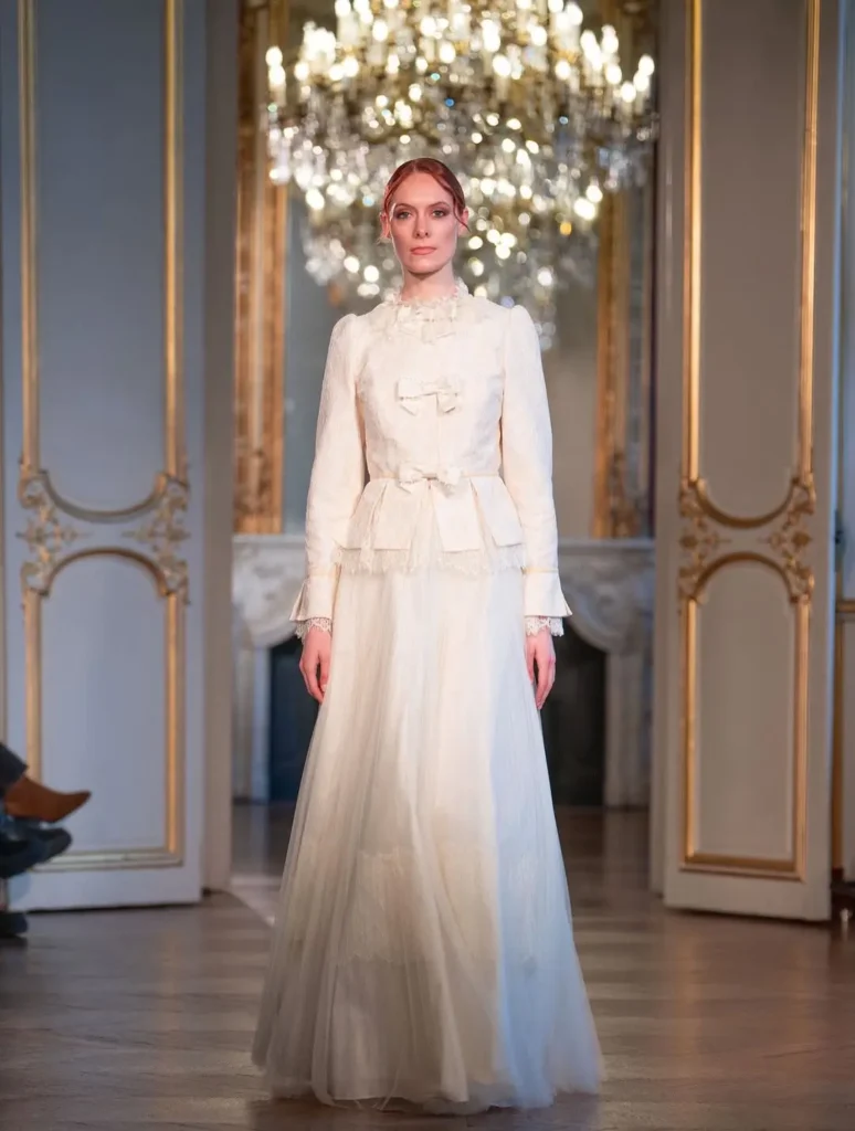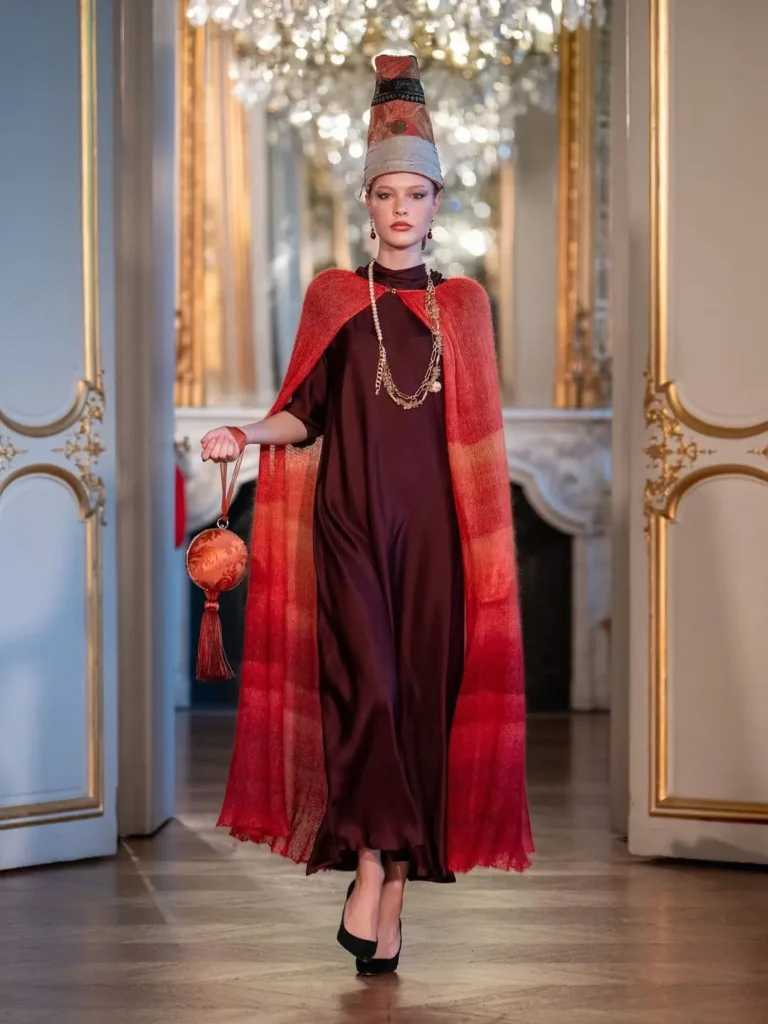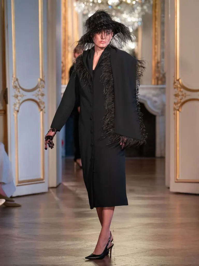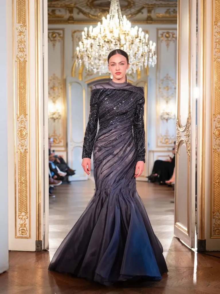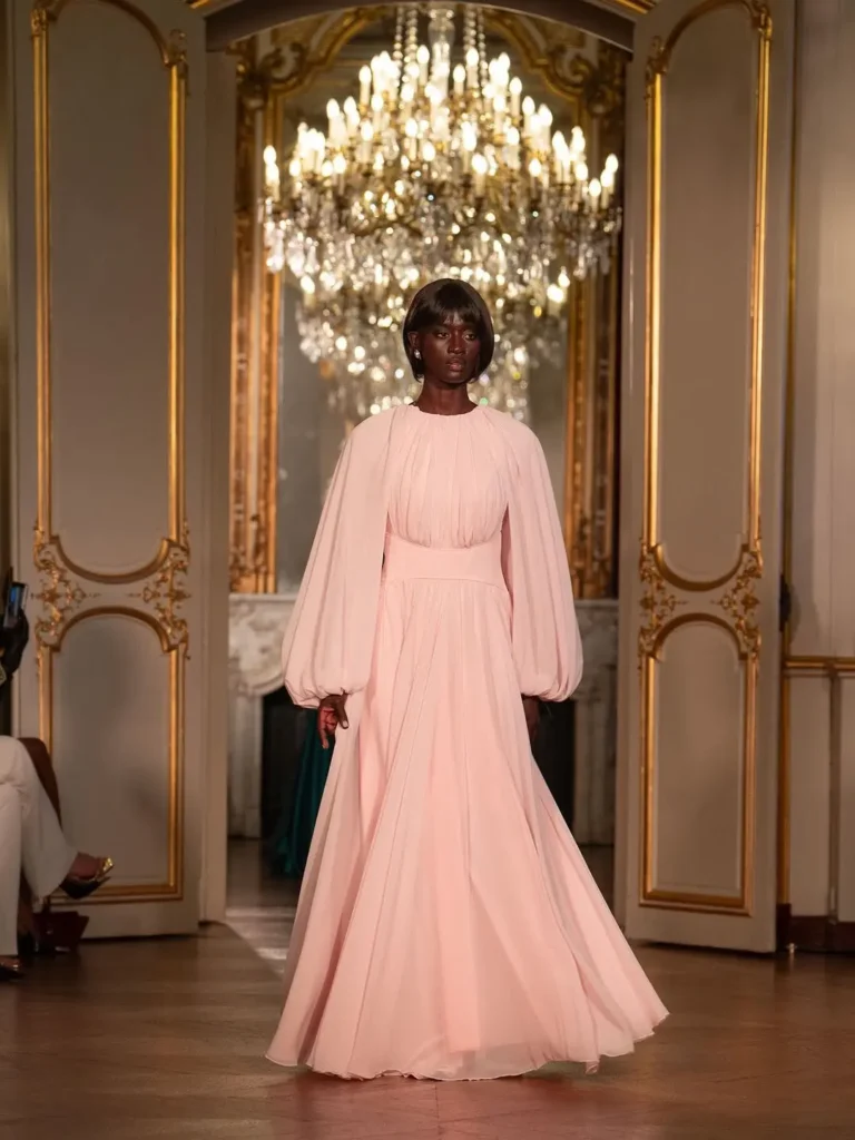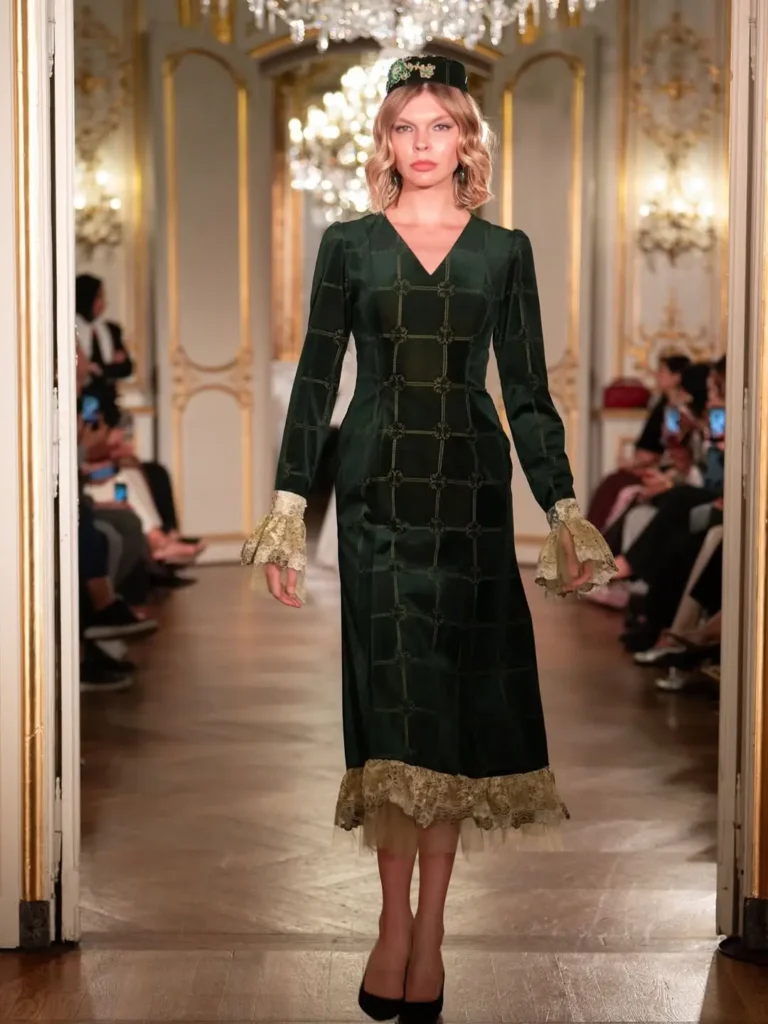 The Serbian-based house is known for its incorporation of Balkan tradition, be it through designs or past techniques. So opening Modest Fashion Week, the house stuck to its codes, presenting a palette of rich golds, browns, and light shades of cream into drop waist gowns and delicately embroidered kaftans that referenced architecture. Titled “The Unseen Crown”, designer Sedžda Zukorlić explained how the collection came to be by reflecting on her inner world. How feminine strength and struggle are rarely seen. Through the designer’s reflections, the collection continues to observe female identity where form and details balance one another. It is regal, refined, and opulent in a traditional sense that complements the gilded room at the Hôtel Le Marois.