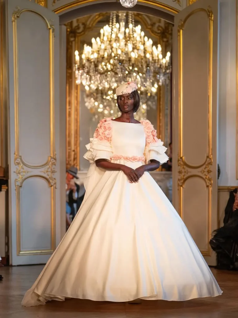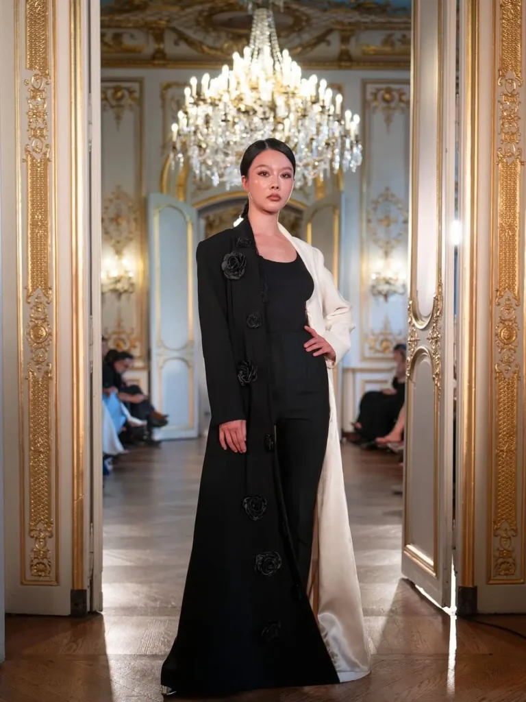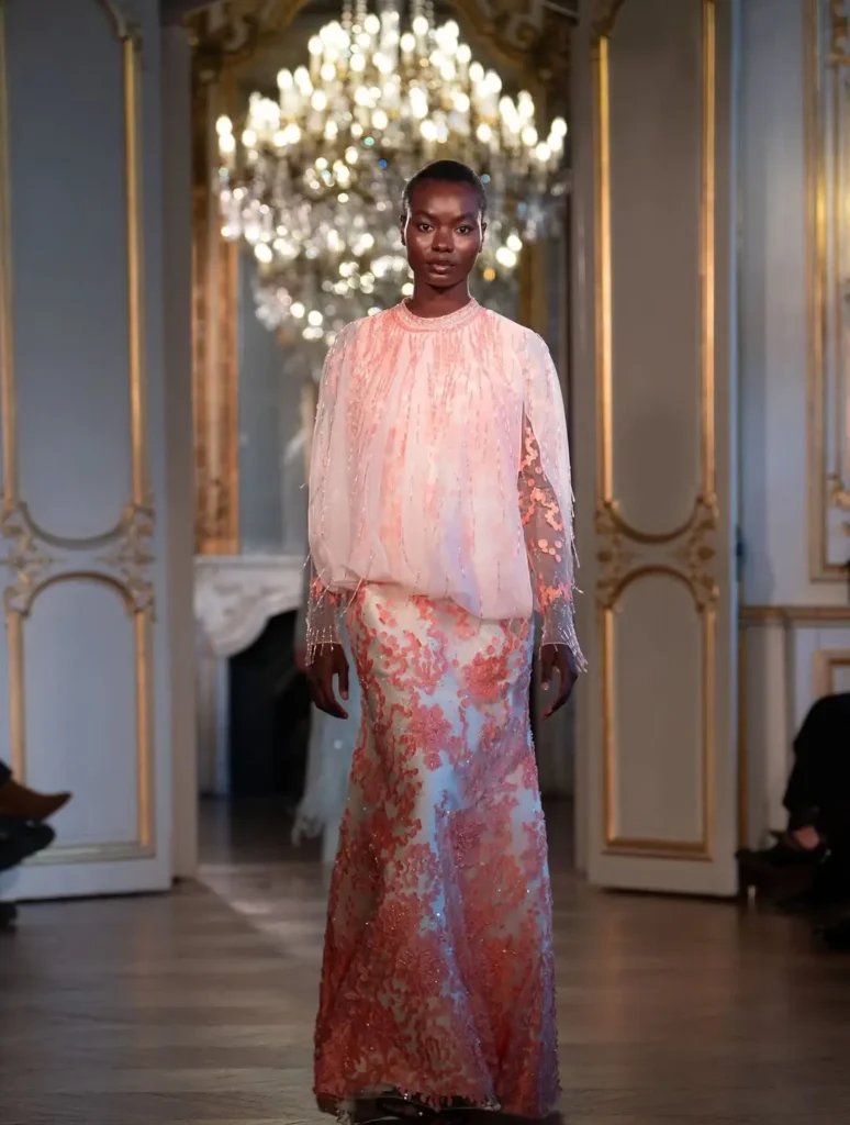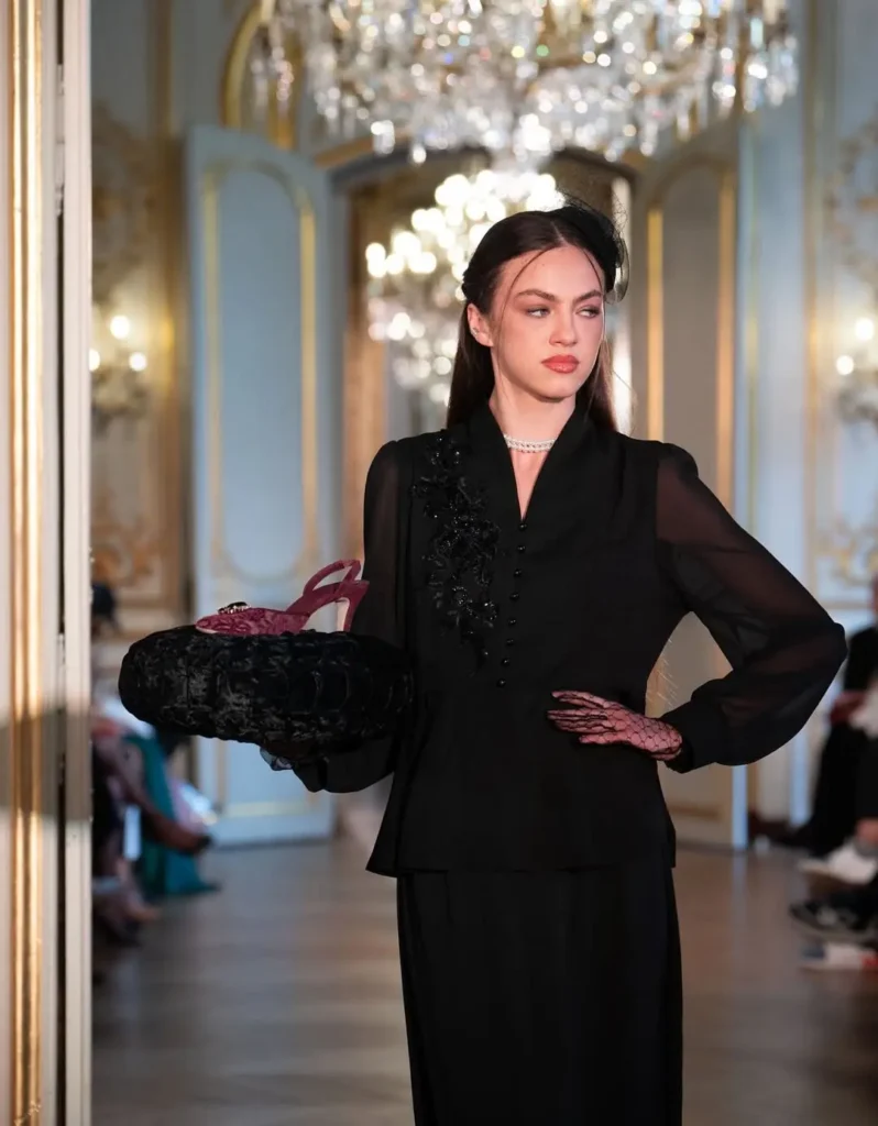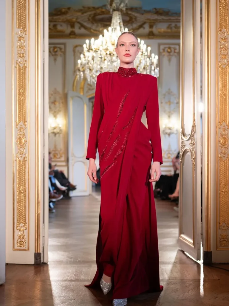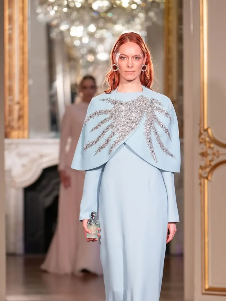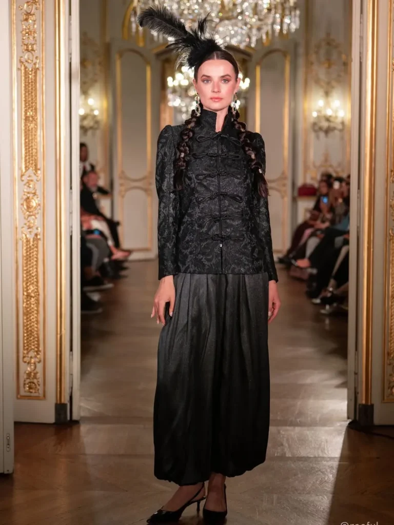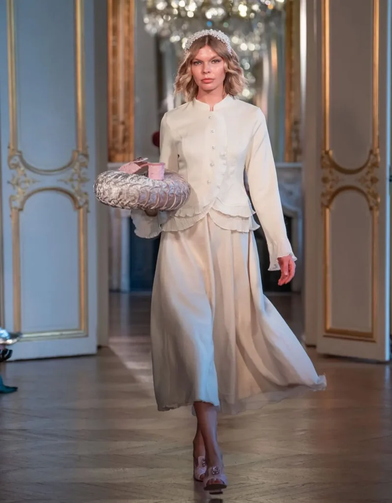 The Serbian-based house is known for its incorporation of Balkan tradition, be it through designs or past techniques. So opening Modest Fashion Week, the house stuck to its codes, presenting a palette of rich golds, browns, and light shades of cream into drop waist gowns and delicately embroidered kaftans that referenced architecture. Titled “The Unseen Crown”, designer Sedžda Zukorlić explained how the collection came to be by reflecting on her inner world. How feminine strength and struggle are rarely seen. Through the designer’s reflections, the collection continues to observe female identity where form and details balance one another. It is regal, refined, and opulent in a traditional sense that complements the gilded room at the Hôtel Le Marois.