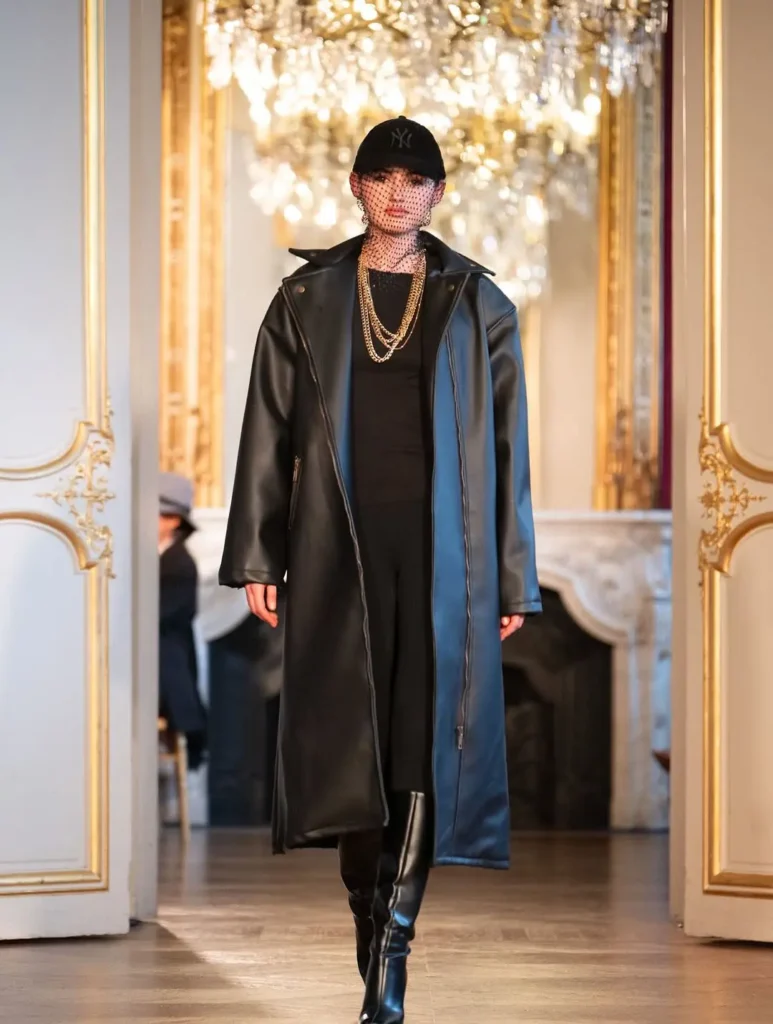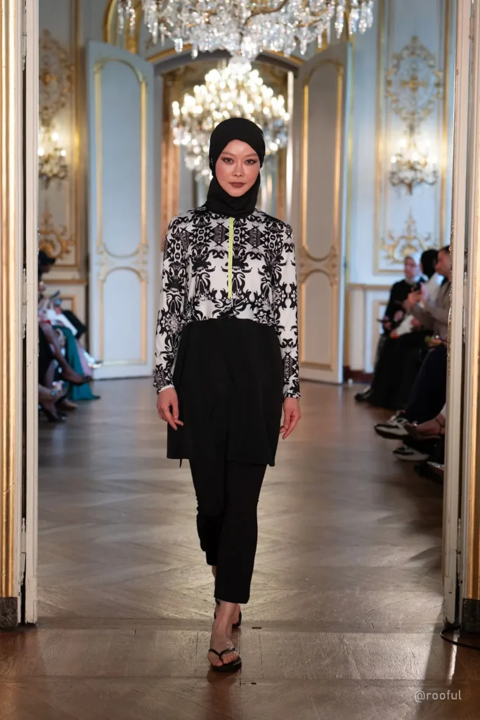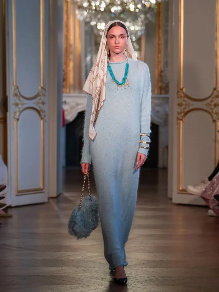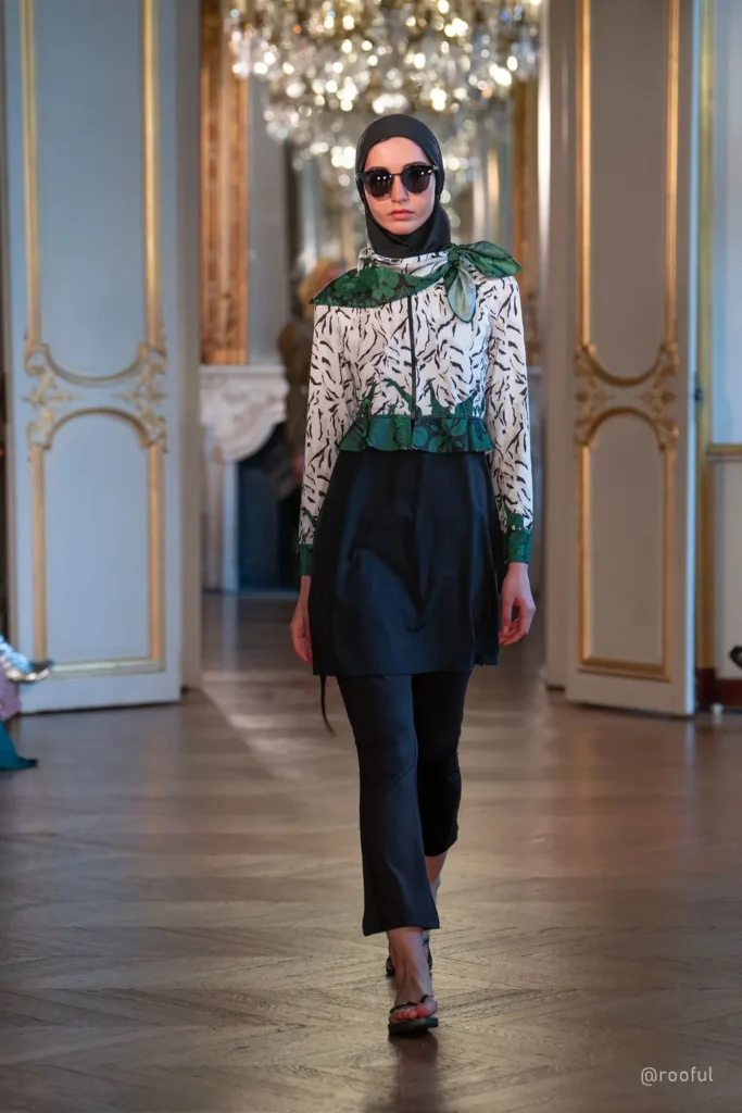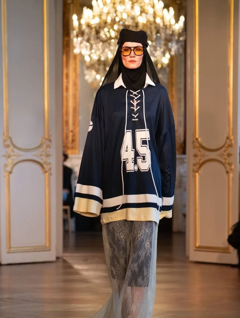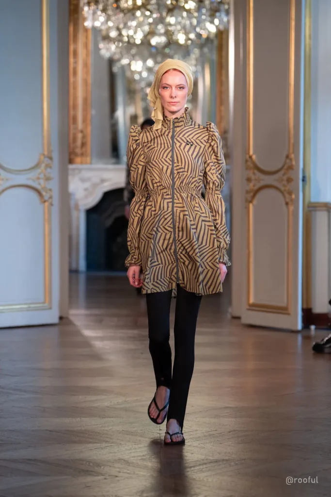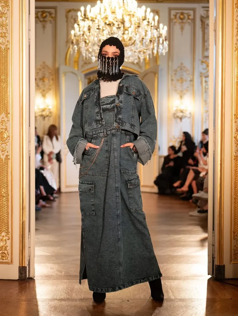 A contemporary modest brand whose design sits at the intersection of traditional modest wear, Parisian energy, and urban street culture, SOUTOURA brings a lot of new modest concepts to the forefront. Their collection presented ultra-long sports jerseys, track suits ballooned and ruffled, and embroidered wool ski masks, all a nod to contemporary street clothing. This was contrasted with neutral pieces, lacquered leather jackets, crisp white shirts, and the evergreen denim dress, showcasing the brand’s dual DNA that creates their modest vision.