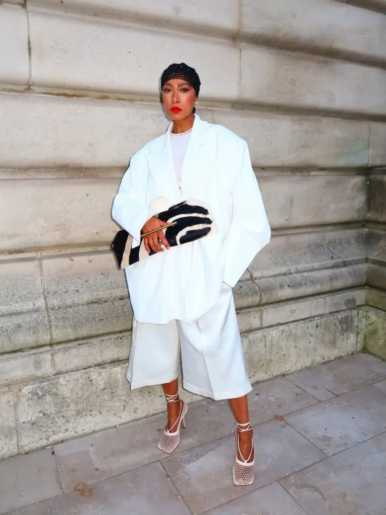 Some kept their fits simple and minimalistic, allowing for draping and jewellery to do the talking. This is best seen on creator Rogueya Tahir, who wore an olive green dress from Khanum. Whereas TV host, Lylia Bouaziz, wore an all-black ensemble that spotlighted a vintage-looking sautoir that felt like a metal tie. Creator Sissi Da Silva went a similar route with an all-white outfit, with an oversized silhouette that commanded presence. Paired with a zebra print clutch by Cameo de Bore, it made a statement without being too overpowering.