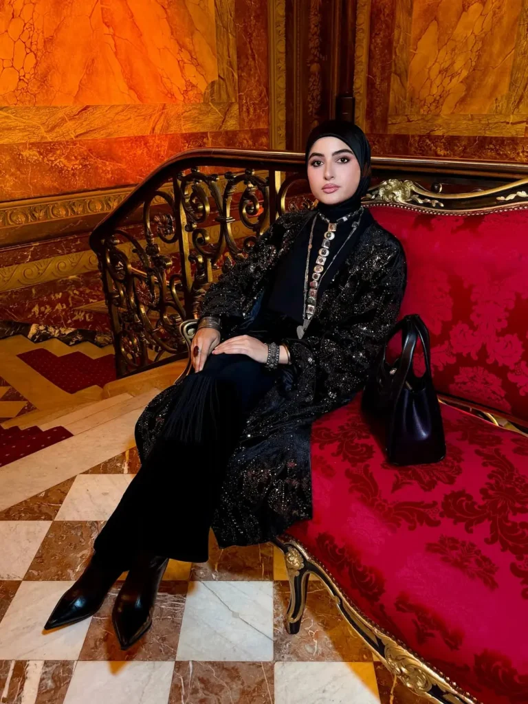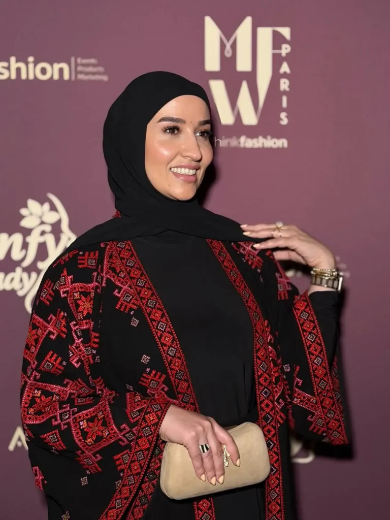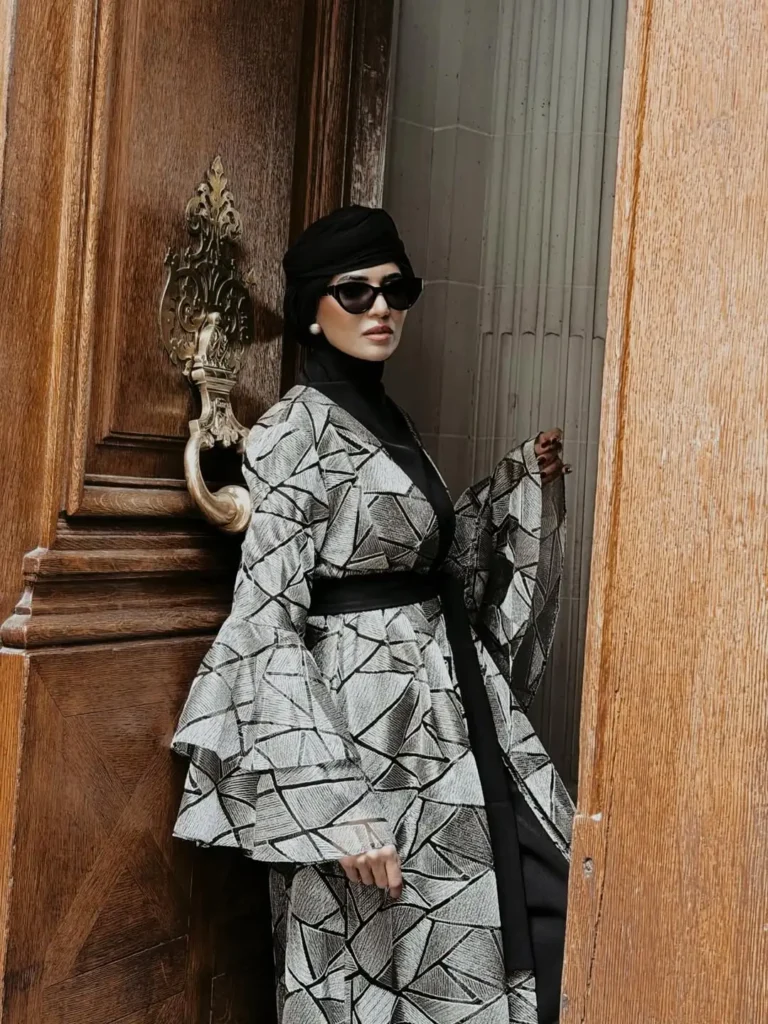 On the other hand, there were those who went the geometric route. Designer Hama Yassen opted for an embroidered geometric abaya, while Aya Abdelhakam wore a geometric kaftan with kimono sleeves.