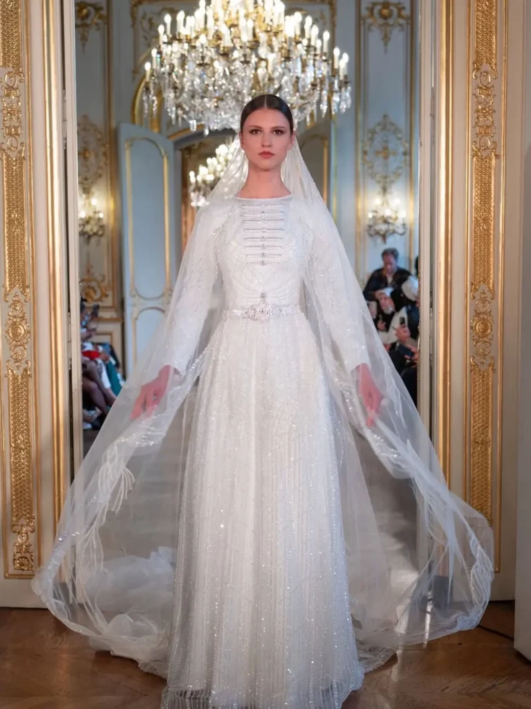 Russia-based fashion house Aynaeva opened Day 2 with a series of bridalwear. Draped in cultural motifs, each dress took one to a new silhouette, presenting different versions of the modest bride. Details here shaped everything, with some highlighted in gold embroidery and others in crystal detailing in the form of foliage and flowers.