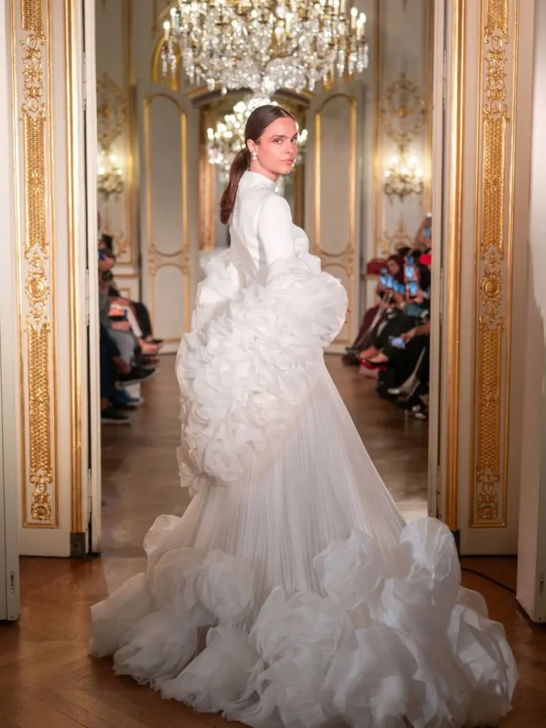 In a light palette perfect for 2026’s earlier months, Betul Saday showcased couture-level tailoring within fluid shapes and refined designs. Pearl and feather trims defined some pieces, while others took to drop waists, embroidered capes, and subtle detailing.