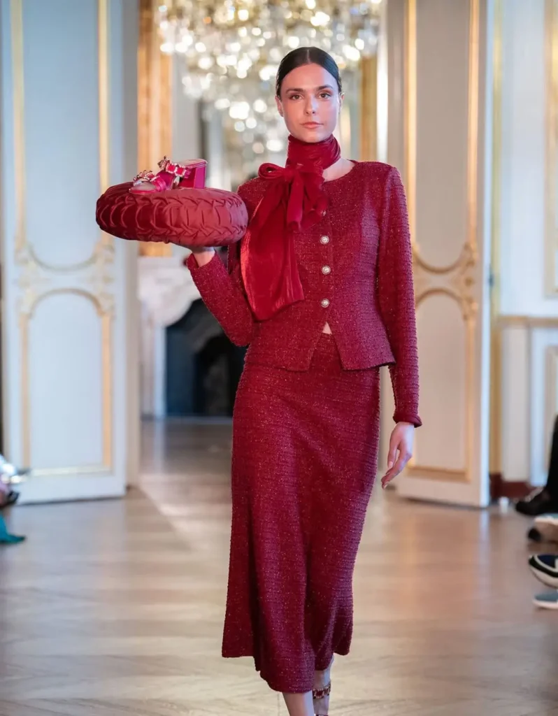Blending together North Neigerain heritage and Italian craftsmanship, London-based footwear brand Asmau Ardo presented one of the more theatrical shows of the day. Showcasing their SS26 collection on plush velvet cushions, the runway consisted of models strutting with the cushion in hand, spotlighting the shoes in a physically demanding way, whilst complemented with modest outfits that would suit each shoe’s mood.