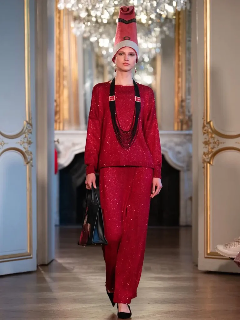 Bringing Kazakh fashion to the French capital, Muradym’s collection continues with its brand DNA of reinterpreting Kazakh heritage through a modern lens. Velvets, silks, and other fabrics were fashioned into contemporary European wear while retaining Kazakh motifs and patterns. Dresses played with the juxtaposition of fluidity and restraint, while skirt suits and casual dresses were complemented with traditional kalpak hats.