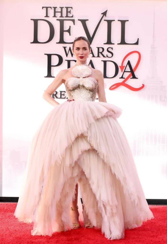 Contrasting the leading ladies, Emily Blunt took to the red carpet in a textured beige gown from Schiaparelli Spring 2026 Haute Couture collection. While this isn’t the first time that Schiaparelli has been featured on the Devil Wears Prada 2 run, this gown definitely stands out from the other looks for its asymmetrical skirt, mushrooming-style bodice, and the maison’s signature shadow silhouette. The gown was paired with jewellery from Mikimoto, a mix of cultured pearls, gold, and diamonds. The look was kept simple with a choker necklace, and matching bracelets and earrings.