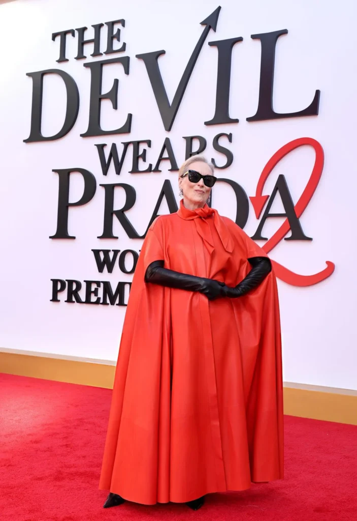 Starting with the “devil” herself, Meryl Streep stepped onto the carpet in a dramatic, devilish red leather cape by Sarah Burton’s Givenchy. Paired with black opera gloves, it channels Streep’s character flawlessly, while statement Givenchy sunglasses reference Anna Wintour, the inspiration behind Streep’s character.