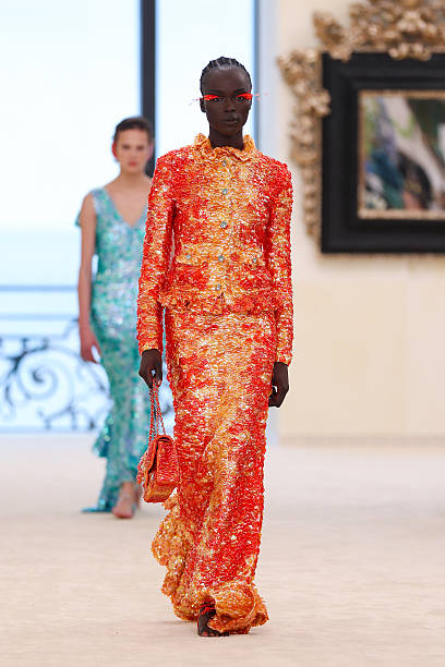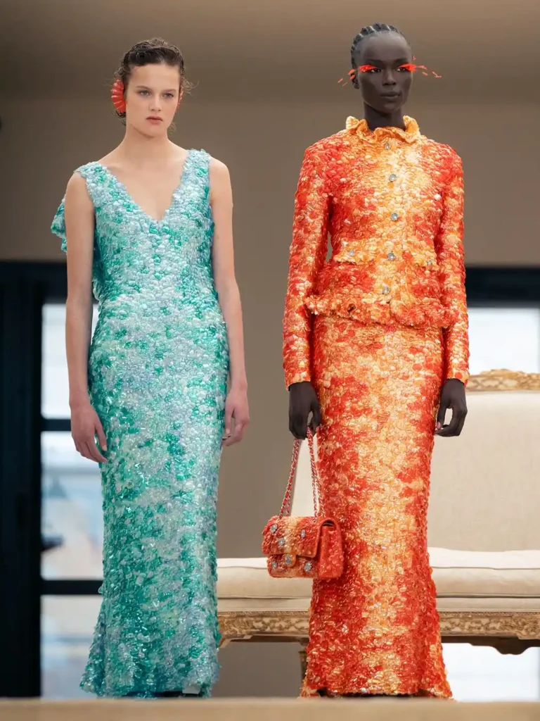 Then came the mermaids. Blazy’s fascination with the mythic sea creature gave the collection its fantasy charge, most memorably through a turquoise sequined gown with a fishtail hem that closed the show. It could have gone costume, but instead it captured the wider mood of the collection.