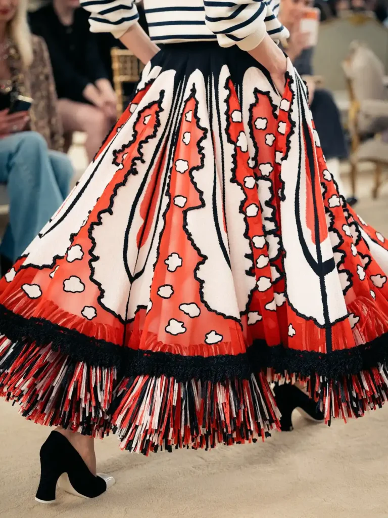 There were also flashes of pure fashion theatre. A giant straw basket, baby shoe charms dangling from a bag, a pregnant Kaya Wilkins styled in a bikini top and tweed skirt suit, and accessories designed to spark instant Chanelmania. In those moments, Blazy seemed to nod gently to Karl Lagerfeld’s talent for turning a collection into a pop-cultural event, while still keeping Gabrielle Chanel’s original language at the centre.